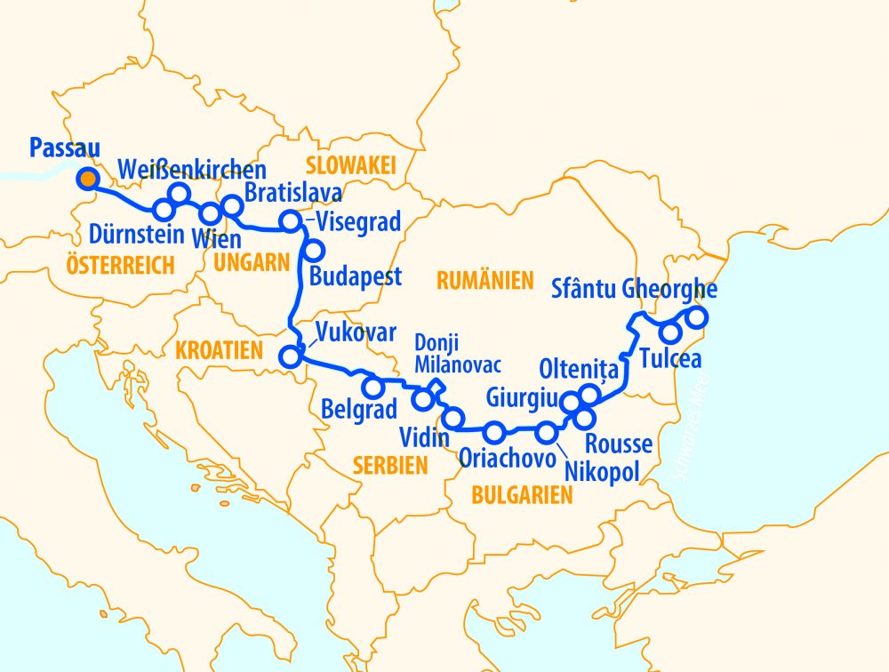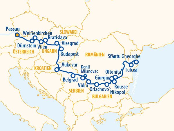 Weiter flussabwärts entdecken wir neue Länder und Kulturen: Kroatien mit Vukovar, Serbien mit der lebendigen Metropole Belgrad. In Bulgarien erwartet uns Vidin, in Rumänien die Hafenstadt Giurgiu – eingebettet in die weiten Landschaften der Walachei. Ein besonderes Highlight ist das Donaudelta bei Sfantu Gheorghe. Inmitten unberührter Natur entdecken wir Europas artenreichstes Feuchtgebiet. Wir gleiten vorbei an Rousse, Nikopol, dem imposanten Eisernen Tor und charmanten Orten wie Oriachovo, Donji Milanovac und Visegrad.